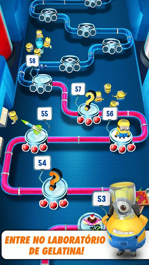 Divirta-se mais em Meu Malvado Favorito: Minion Rush! Os fiéis Minions de Gru estão prontos para seu maior desafio: o laboratório de gelatina, uma nova interface de jogo que exibe o progresso do jogador! Ajude os Minions a produzir uma gelatina mais gostosa recolhendo frutas para colocar na máquina de gelatina: salte, desvie de obstáculos e recolha Bananas em missões frenéticas!